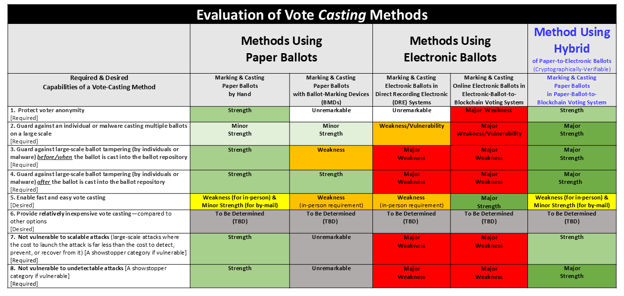 The traditional electronic-ballot-to-blockchian voting method is vulnerable to undetectable and large-scale hacks and would require a whole new election if the electronic ballots or blockchain were hacked because no paper ballots would exist for a hand-count or otherwise.
