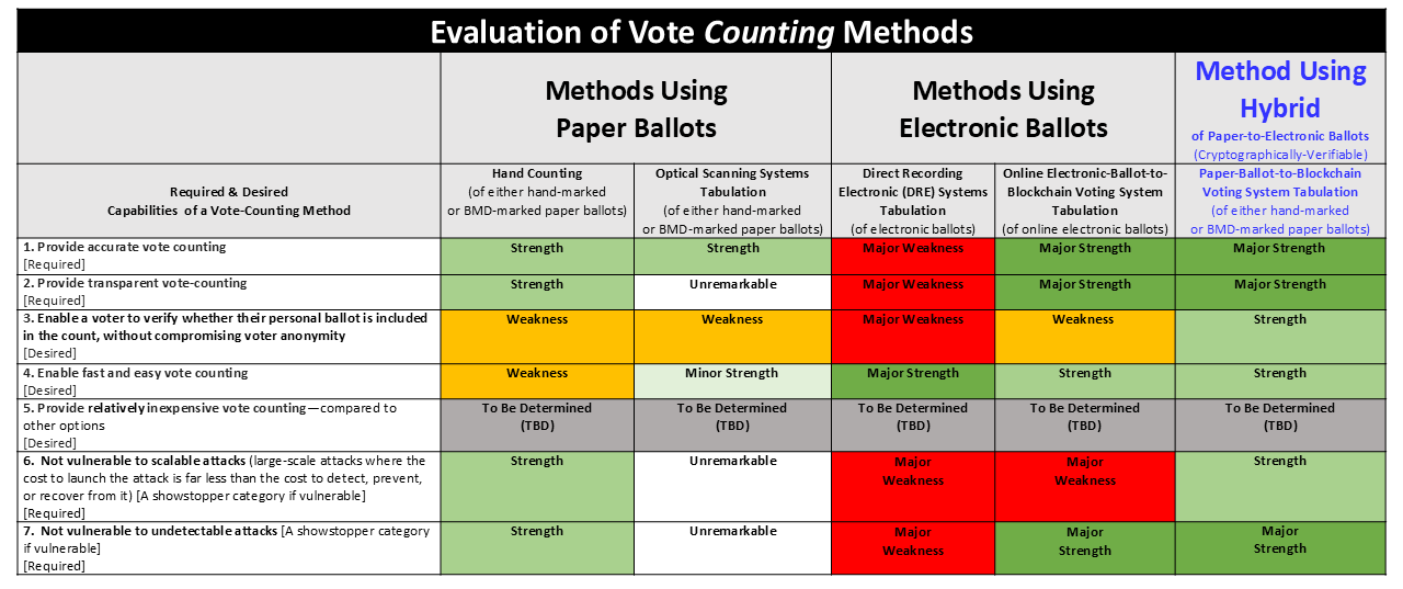 The Hybrid Paper-Ballot-to-Blockchain Voting method(the PaperBallotchain solution) has more strengths than the methods using only paper ballots or electronic ballots.
